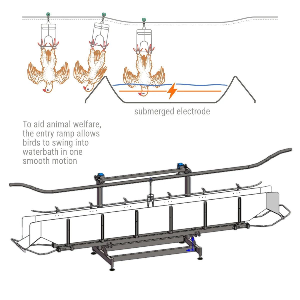 After being allowed time to settle, several birds are conveyed into a water-bath where their heads are submerged, completing an electrical circuit and causing stunning. To aid animal welfare, the sloped entry ramp allows birds to swing into the water-bath in one smooth motion.